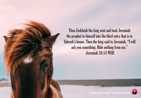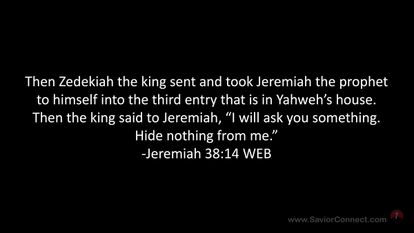 Then Zedekiah the king sent and took Jeremiah the prophet to himself into the third entry that is in Yahweh’s house. Then the king said to Jeremiah, “I will ask you something. Hide nothing from me.” -Jeremiah 38:14 WEB