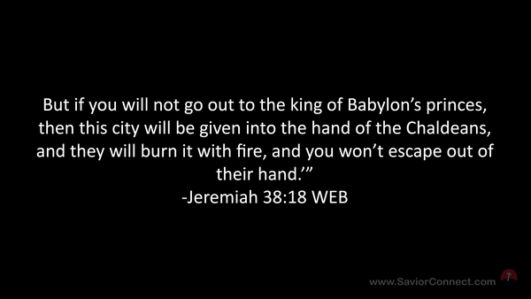 But if you will not go out to the king of Babylon’s princes, then this city will be given into the hand of the Chaldeans, and they will burn it with fire, and you won’t escape out of their hand.’” -Jeremiah 38:18 WEB