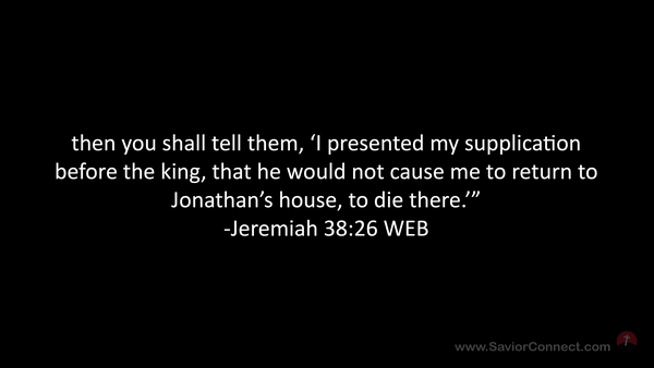 then you shall tell them, 'I presented my supplication before the king, that he would not cause me to return to Jonathan’s house, to die there.’” -Jeremiah 38:26 WEB