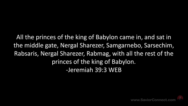 All the princes of the king of Babylon came in, and sat in the middle gate, Nergal Sharezer, Samgarnebo, Sarsechim, Rabsaris, Nergal Sharezer, Rabmag, with all the rest of the princes of the king of Babylon. -Jeremiah 39:3 WEB