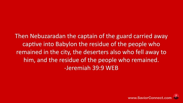 Then Nebuzaradan the captain of the guard carried away captive into Babylon the residue of the people who remained in the city, the deserters also who fell away to him, and the residue of the people who remained. -Jeremiah 39:9 WEB