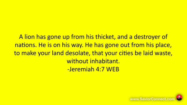 A lion has gone up from his thicket, and a destroyer of nations. He is on his way. He has gone out from his place, to make your land desolate, that your cities be laid waste, without inhabitant. -Jeremiah 4:7 WEB