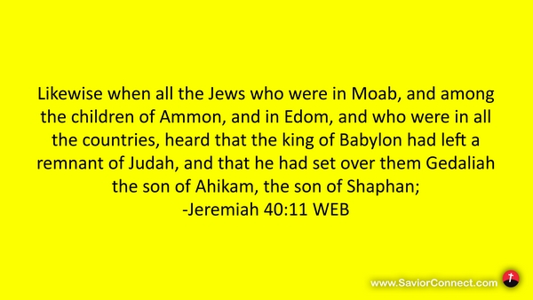 Likewise when all the Jews who were in Moab, and among the children of Ammon, and in Edom, and who were in all the countries, heard that the king of Babylon had left a remnant of Judah, and that he had set over them Gedaliah the son of Ahikam, the son of Shaphan; -Jeremiah 40:11 WEB
