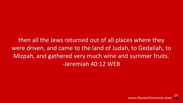 then all the Jews returned out of all places where they were driven, and came to the land of Judah, to Gedaliah, to Mizpah, and gathered very much wine and summer fruits. -Jeremiah 40:12 WEB