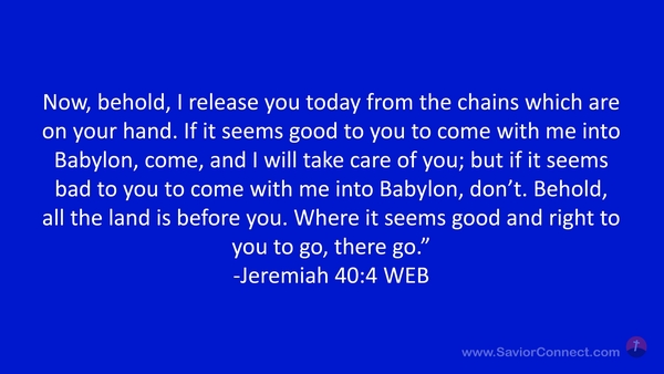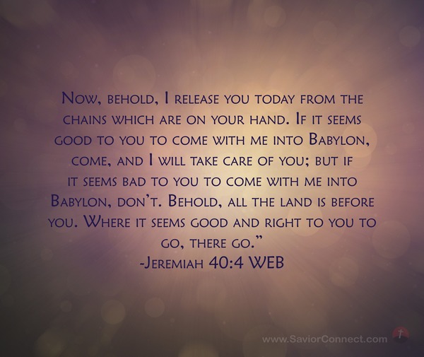 Now, behold, I release you today from the chains which are on your hand. If it seems good to you to come with me into Babylon, come, and I will take care of you; but if it seems bad to you to come with me into Babylon, don’t. Behold, all the land is before you. Where it seems good and right to you to go, there go.” -Jeremiah 40:4 WEB