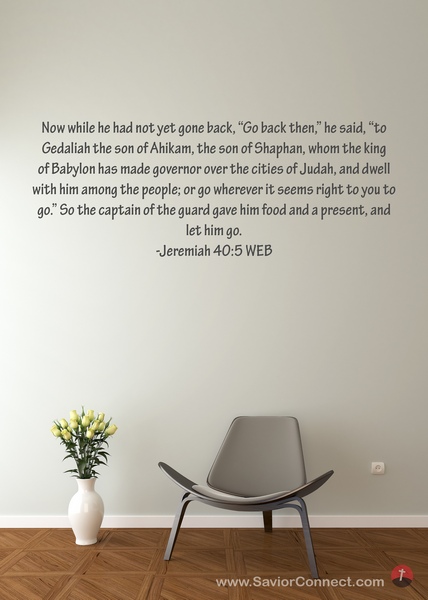 Now while he had not yet gone back, “Go back then,” he said, “to Gedaliah the son of Ahikam, the son of Shaphan, whom the king of Babylon has made governor over the cities of Judah, and dwell with him among the people; or go wherever it seems right to you to go.” So the captain of the guard gave him food and a present, and let him go. -Jeremiah 40:5 WEB