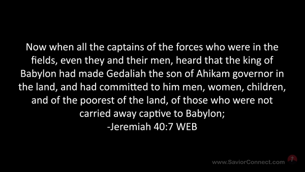 Now when all the captains of the forces who were in the fields, even they and their men, heard that the king of Babylon had made Gedaliah the son of Ahikam governor in the land, and had committed to him men, women, children, and of the poorest of the land, of those who were not carried away captive to Babylon; -Jeremiah 40:7 WEB