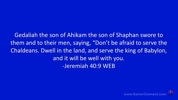 Gedaliah the son of Ahikam the son of Shaphan swore to them and to their men, saying, “Don’t be afraid to serve the Chaldeans. Dwell in the land, and serve the king of Babylon, and it will be well with you. -Jeremiah 40:9 WEB