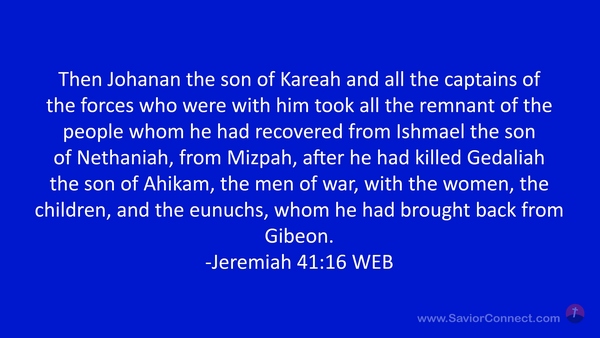 Then Johanan the son of Kareah and all the captains of the forces who were with him took all the remnant of the people whom he had recovered from Ishmael the son of Nethaniah, from Mizpah, after he had killed Gedaliah the son of Ahikam, the men of war, with the women, the children, and the eunuchs, whom he had brought back from Gibeon. -Jeremiah 41:16 WEB