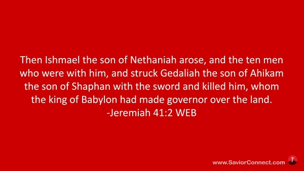 Then Ishmael the son of Nethaniah arose, and the ten men who were with him, and struck Gedaliah the son of Ahikam the son of Shaphan with the sword and killed him, whom the king of Babylon had made governor over the land. -Jeremiah 41:2 WEB