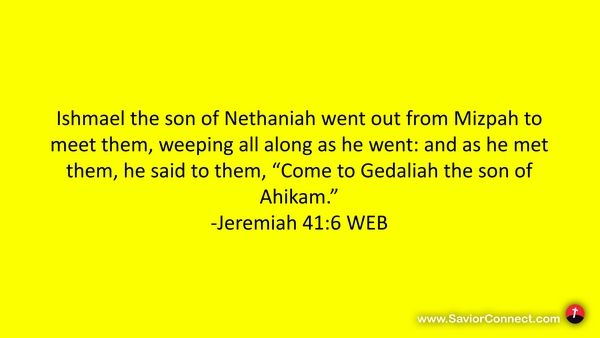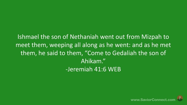 Ishmael the son of Nethaniah went out from Mizpah to meet them, weeping all along as he went: and as he met them, he said to them, “Come to Gedaliah the son of Ahikam.” -Jeremiah 41:6 WEB