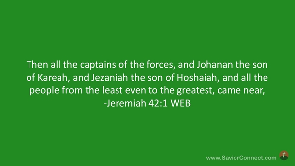 Then all the captains of the forces, and Johanan the son of Kareah, and Jezaniah the son of Hoshaiah, and all the people from the least even to the greatest, came near, -Jeremiah 42:1 WEB