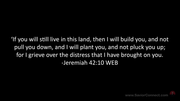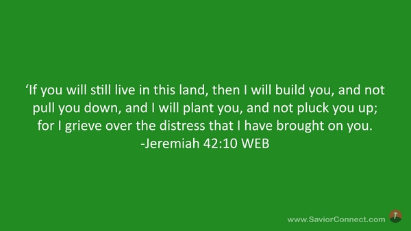 'If you will still live in this land, then I will build you, and not pull you down, and I will plant you, and not pluck you up; for I grieve over the distress that I have brought on you. -Jeremiah 42:10 WEB
