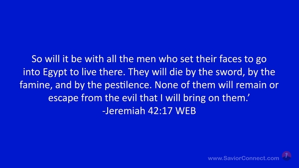 So will it be with all the men who set their faces to go into Egypt to live there. They will die by the sword, by the famine, and by the pestilence. None of them will remain or escape from the evil that I will bring on them.’ -Jeremiah 42:17 WEB