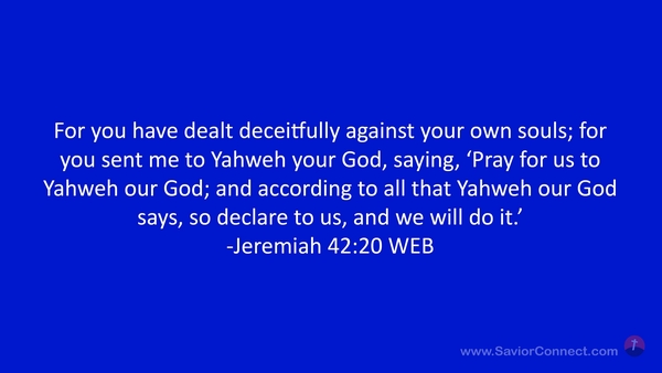 For you have dealt deceitfully against your own souls; for you sent me to Yahweh your God, saying, 'Pray for us to Yahweh our God; and according to all that Yahweh our God says, so declare to us, and we will do it.’ -Jeremiah 42:20 WEB