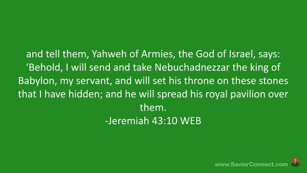 and tell them, Yahweh of Armies, the God of Israel, says: 'Behold, I will send and take Nebuchadnezzar the king of Babylon, my servant, and will set his throne on these stones that I have hidden; and he will spread his royal pavilion over them. -Jeremiah 43:10 WEB
