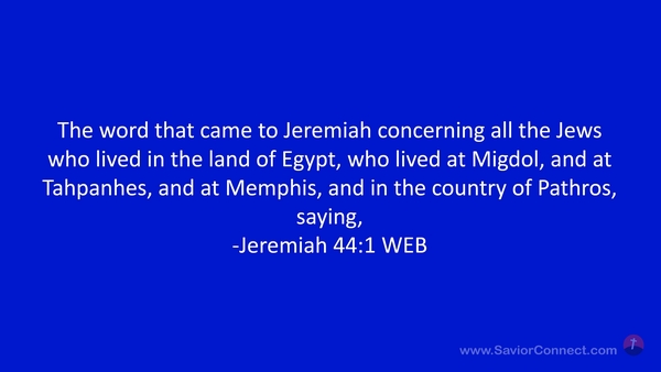 The word that came to Jeremiah concerning all the Jews who lived in the land of Egypt, who lived at Migdol, and at Tahpanhes, and at Memphis, and in the country of Pathros, saying, -Jeremiah 44:1 WEB