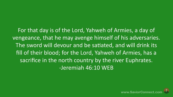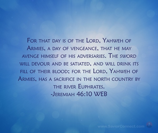 For that day is of the Lord, Yahweh of Armies, a day of vengeance, that he may avenge himself of his adversaries. The sword will devour and be satiated, and will drink its fill of their blood; for the Lord, Yahweh of Armies, has a sacrifice in the north country by the river Euphrates. -Jeremiah 46:10 WEB