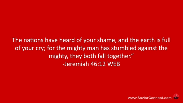 The nations have heard of your shame, and the earth is full of your cry; for the mighty man has stumbled against the mighty, they both fall together.” -Jeremiah 46:12 WEB