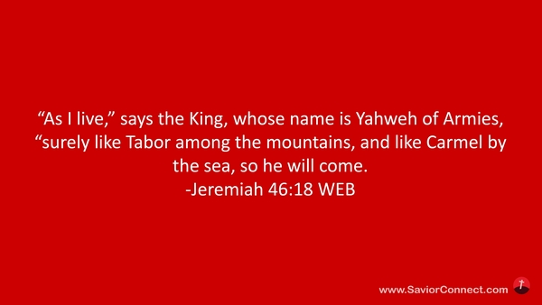 “As I live,” says the King, whose name is Yahweh of Armies, “surely like Tabor among the mountains, and like Carmel by the sea, so he will come. -Jeremiah 46:18 WEB