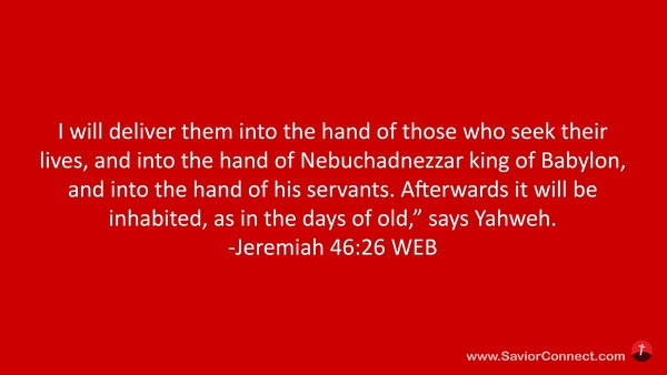 I will deliver them into the hand of those who seek their lives, and into the hand of Nebuchadnezzar king of Babylon, and into the hand of his servants. Afterwards it will be inhabited, as in the days of old,” says Yahweh. -Jeremiah 46:26 WEB