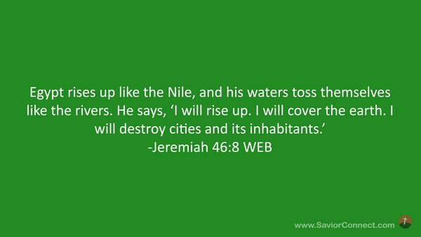 Egypt rises up like the Nile, and his waters toss themselves like the rivers. He says, 'I will rise up. I will cover the earth. I will destroy cities and its inhabitants.’ -Jeremiah 46:8 WEB