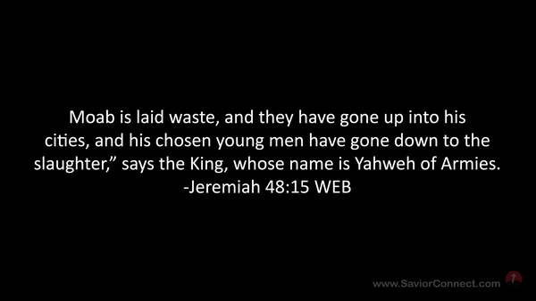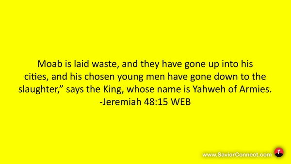 Moab is laid waste, and they have gone up into his cities, and his chosen young men have gone down to the slaughter,” says the King, whose name is Yahweh of Armies. -Jeremiah 48:15 WEB