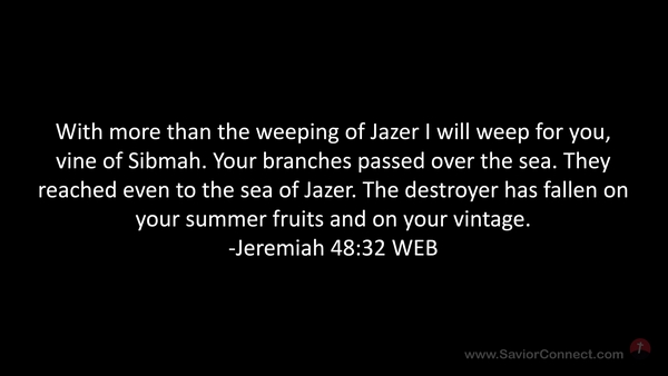 With more than the weeping of Jazer I will weep for you, vine of Sibmah. Your branches passed over the sea. They reached even to the sea of Jazer. The destroyer has fallen on your summer fruits and on your vintage. -Jeremiah 48:32 WEB