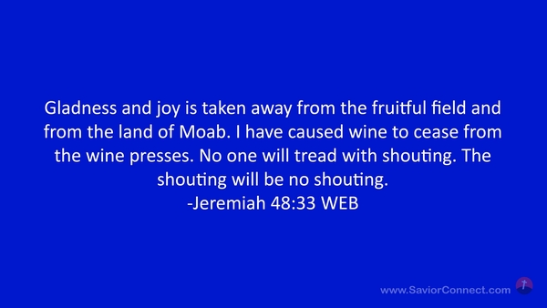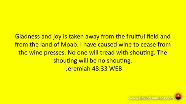 Gladness and joy is taken away from the fruitful field and from the land of Moab. I have caused wine to cease from the wine presses. No one will tread with shouting. The shouting will be no shouting. -Jeremiah 48:33 WEB