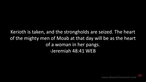 Kerioth is taken, and the strongholds are seized. The heart of the mighty men of Moab at that day will be as the heart of a woman in her pangs. -Jeremiah 48:41 WEB