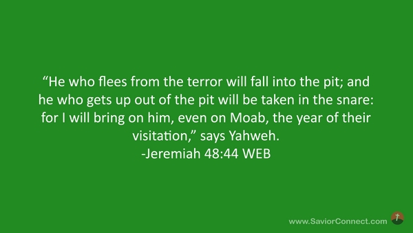 “He who flees from the terror will fall into the pit; and he who gets up out of the pit will be taken in the snare: for I will bring on him, even on Moab, the year of their visitation,” says Yahweh. -Jeremiah 48:44 WEB