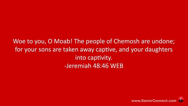 Woe to you, O Moab! The people of Chemosh are undone; for your sons are taken away captive, and your daughters into captivity. -Jeremiah 48:46 WEB