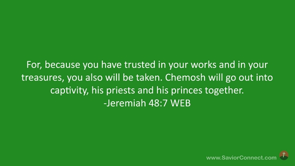 For, because you have trusted in your works and in your treasures, you also will be taken. Chemosh will go out into captivity, his priests and his princes together. -Jeremiah 48:7 WEB