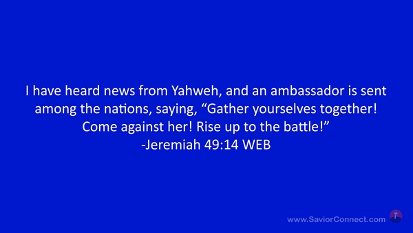 I have heard news from Yahweh, and an ambassador is sent among the nations, saying, “Gather yourselves together! Come against her! Rise up to the battle!” -Jeremiah 49:14 WEB