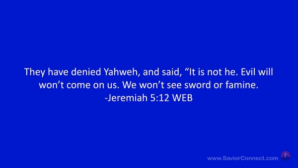 They have denied Yahweh, and said, “It is not he. Evil will won’t come on us. We won’t see sword or famine. -Jeremiah 5:12 WEB