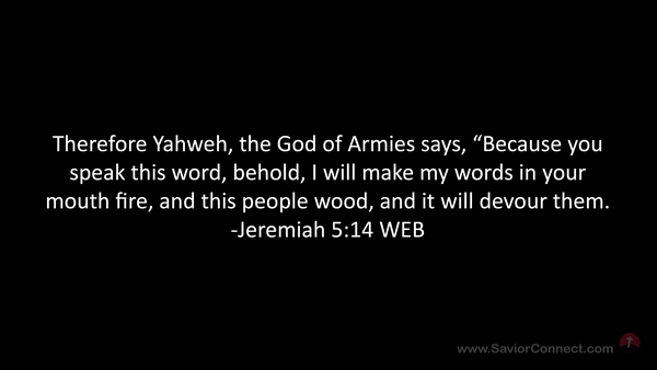 Therefore Yahweh, the God of Armies says, “Because you speak this word, behold, I will make my words in your mouth fire, and this people wood, and it will devour them. -Jeremiah 5:14 WEB