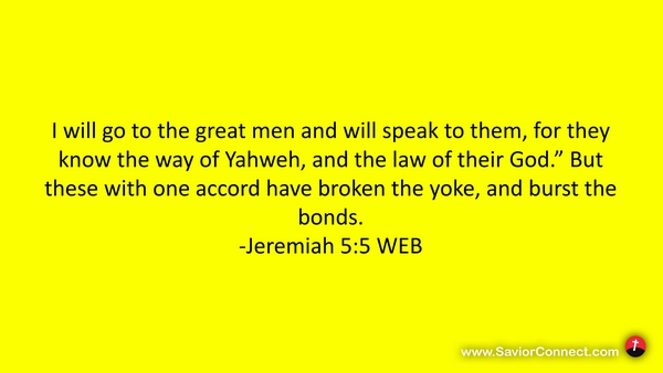 I will go to the great men and will speak to them, for they know the way of Yahweh, and the law of their God.” But these with one accord have broken the yoke, and burst the bonds. -Jeremiah 5:5 WEB