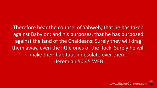 Therefore hear the counsel of Yahweh, that he has taken against Babylon; and his purposes, that he has purposed against the land of the Chaldeans: Surely they will drag them away, even the little ones of the flock. Surely he will make their habitation desolate over them. -Jeremiah 50:45 WEB