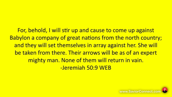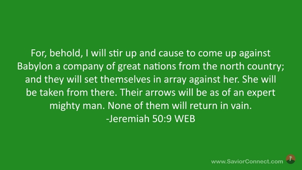 For, behold, I will stir up and cause to come up against Babylon a company of great nations from the north country; and they will set themselves in array against her. She will be taken from there. Their arrows will be as of an expert mighty man. None of them will return in vain. -Jeremiah 50:9 WEB