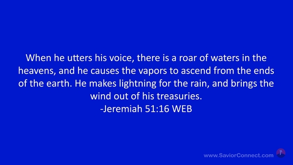 When he utters his voice, there is a roar of waters in the heavens, and he causes the vapors to ascend from the ends of the earth. He makes lightning for the rain, and brings the wind out of his treasuries. -Jeremiah 51:16 WEB