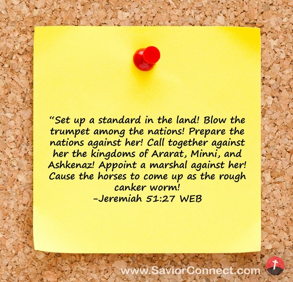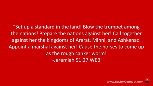 “Set up a standard in the land! Blow the trumpet among the nations! Prepare the nations against her! Call together against her the kingdoms of Ararat, Minni, and Ashkenaz! Appoint a marshal against her! Cause the horses to come up as the rough canker worm! -Jeremiah 51:27 WEB