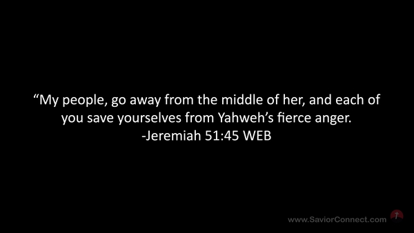 “My people, go away from the middle of her, and each of you save yourselves from Yahweh’s fierce anger. -Jeremiah 51:45 WEB