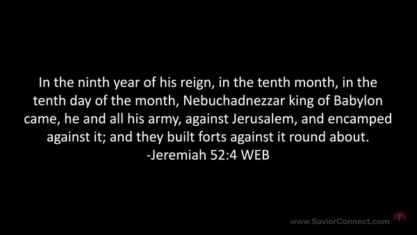 In the ninth year of his reign, in the tenth month, in the tenth day of the month, Nebuchadnezzar king of Babylon came, he and all his army, against Jerusalem, and encamped against it; and they built forts against it round about. -Jeremiah 52:4 WEB