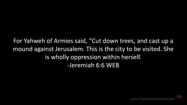 For Yahweh of Armies said, “Cut down trees, and cast up a mound against Jerusalem. This is the city to be visited. She is wholly oppression within herself. -Jeremiah 6:6 WEB