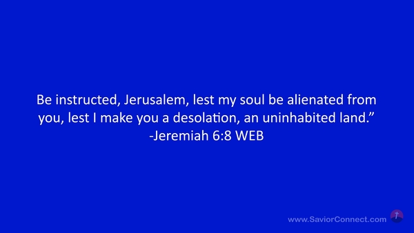 Be instructed, Jerusalem, lest my soul be alienated from you, lest I make you a desolation, an uninhabited land.” -Jeremiah 6:8 WEB