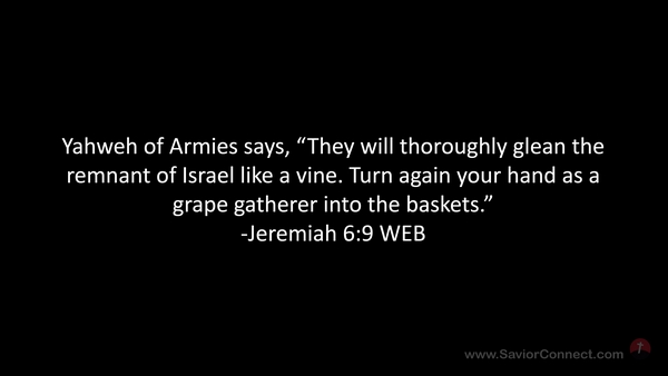 Yahweh of Armies says, “They will thoroughly glean the remnant of Israel like a vine. Turn again your hand as a grape gatherer into the baskets.” -Jeremiah 6:9 WEB