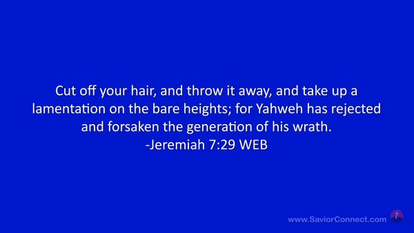 Cut off your hair, and throw it away, and take up a lamentation on the bare heights; for Yahweh has rejected and forsaken the generation of his wrath. -Jeremiah 7:29 WEB