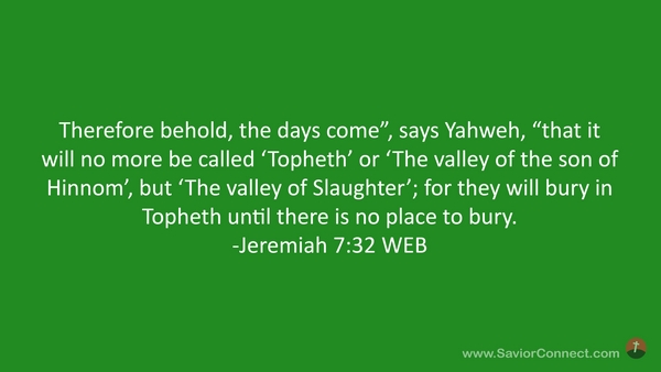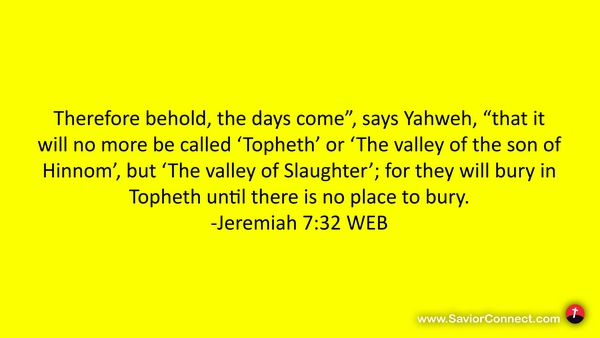 Therefore behold, the days come”, says Yahweh, “that it will no more be called 'Topheth’ or 'The valley of the son of Hinnom’, but 'The valley of Slaughter’; for they will bury in Topheth until there is no place to bury. -Jeremiah 7:32 WEB