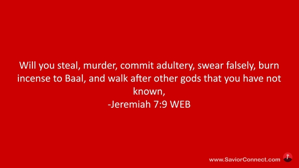 Will you steal, murder, commit adultery, swear falsely, burn incense to Baal, and walk after other gods that you have not known, -Jeremiah 7:9 WEB