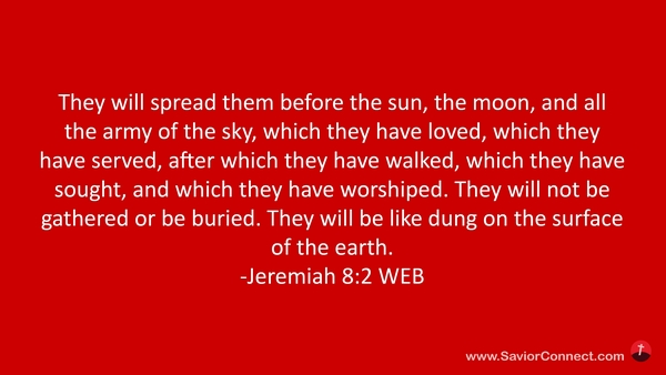 They will spread them before the sun, the moon, and all the army of the sky, which they have loved, which they have served, after which they have walked, which they have sought, and which they have worshiped. They will not be gathered or be buried. They will be like dung on the surface of the earth. -Jeremiah 8:2 WEB